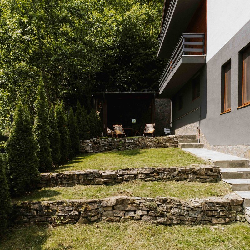 Outdoor generos: Grădină și spații de relaxare, curte cu foișor, mobilier de grădină, loc de joacă, balcon privat, mobilat și cu vedere spre munți